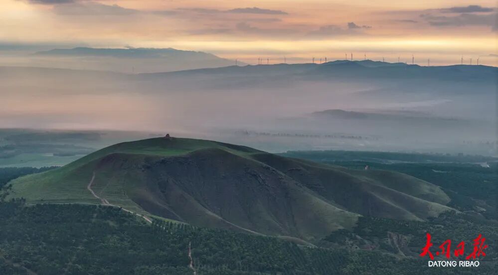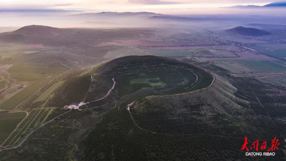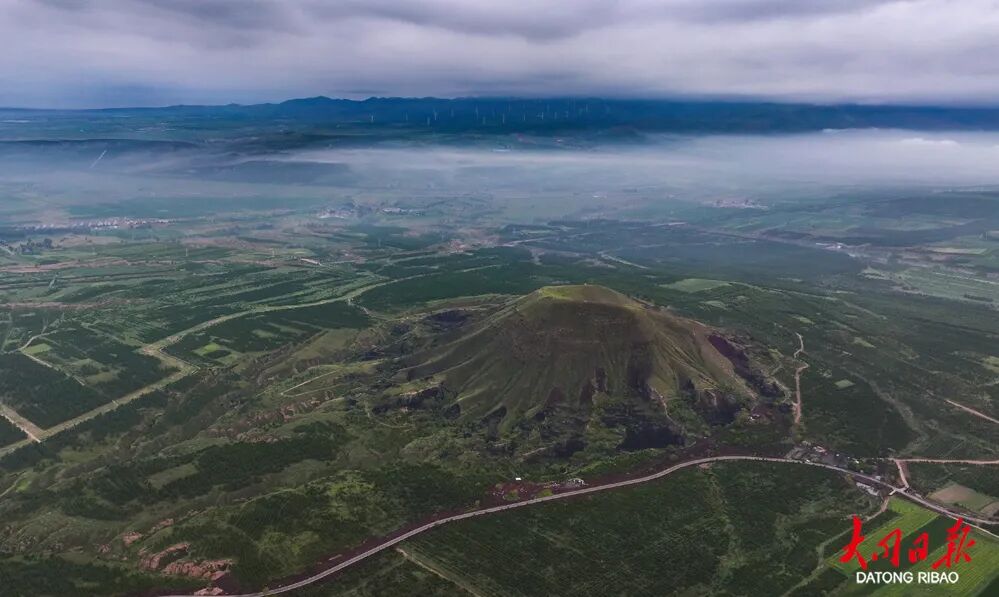 8月的阳光倾泻在云中大地上,驱车前往大同火山群,车窗外的风景从葱郁的田野渐变为广袤无垠的旷野。远处,锥形的火山群轮廓被蒸腾的热浪晕染,这片曾喷发炽热岩浆的土地,正以另一种方式“爆发”——独特的地质奇观